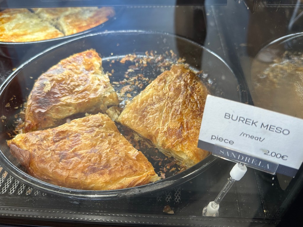 Serbian cuisine leans heavily on grilled meats and pies. Ćevapi are the flag bearer, even if Bosnia claims them too, and they rarely disappoint. Ajvar, made from red peppers, eggplant, and garlic, was the standout for me. Sweet, smoky, and just spicy enough, it works with almost everything. Serbian salad, a simple mix of tomatoes, cucumbers, onions, and salty white cheese, shows up everywhere and does exactly what it needs to do. Burek is a staple and Trpković Bakery lives up to its reputation with crisp, generously filled pastries, though slightly greasier than ideal. Meals are often paired with rakija, the local fruit brandy that is deceptively strong, sometimes spicy, occasionally anise-forward, and very much not meant to be rushed. Desserts are less emphasized, but the famous Moscow Cake at Hotel Moskva is spoken of with reverence. Visually stunning, though for me, overly sweet and flatter in flavor than expected.