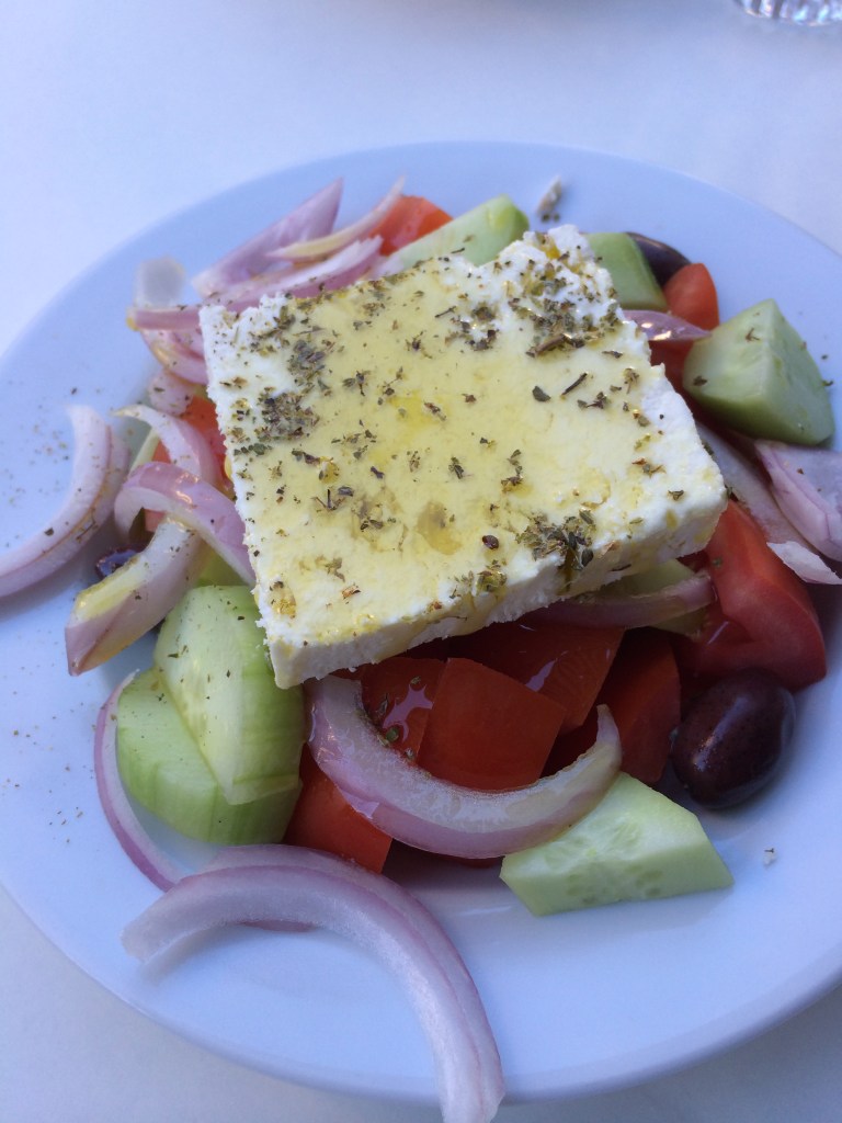 6. My first meal in Athens started with the Greek salad known to Greeks as just salad. It consisted of a giant slab of feta , cooked chickpeas, onions, tomatoes finished with a generous drizzle of olive oil. It was simple but very refreshing. The freshness of the ingredients made all the difference. I went back for my salad fix everyday.