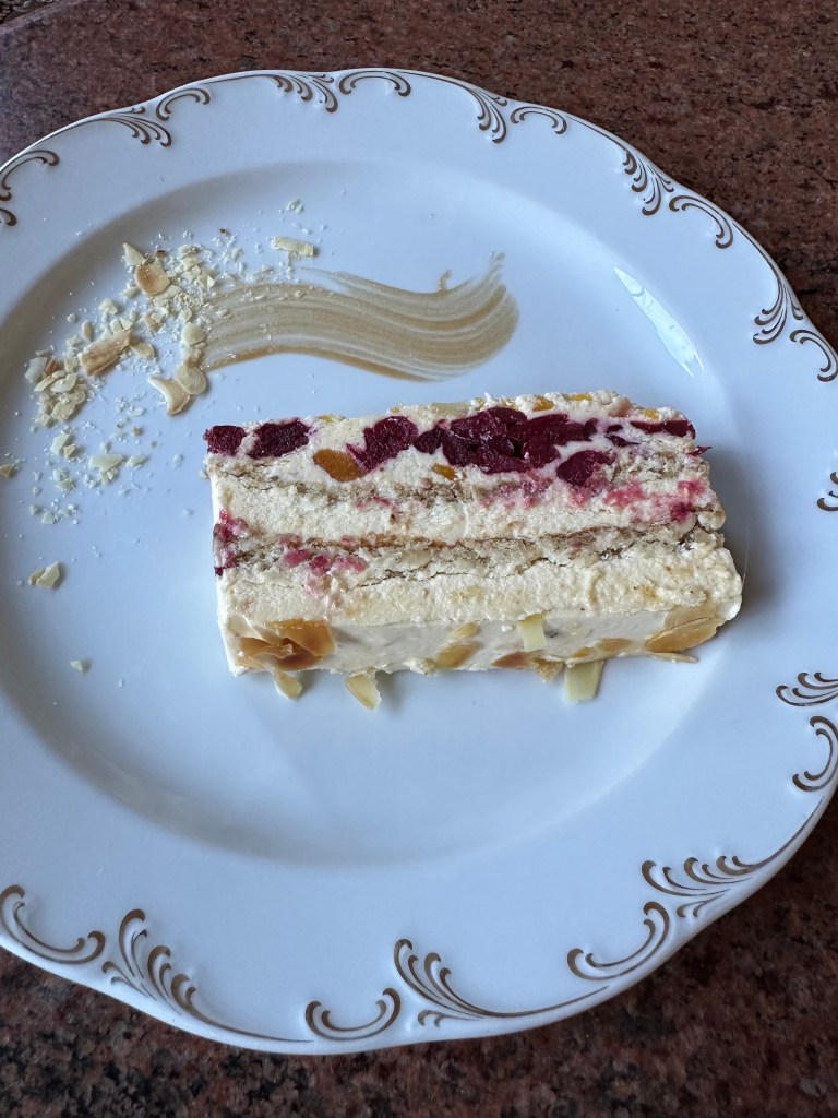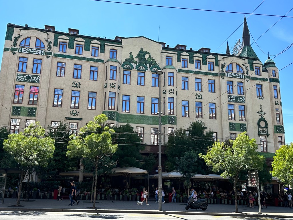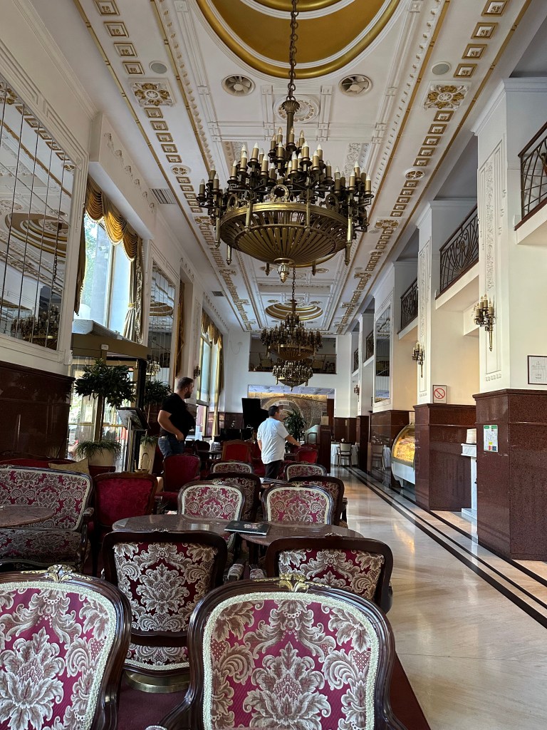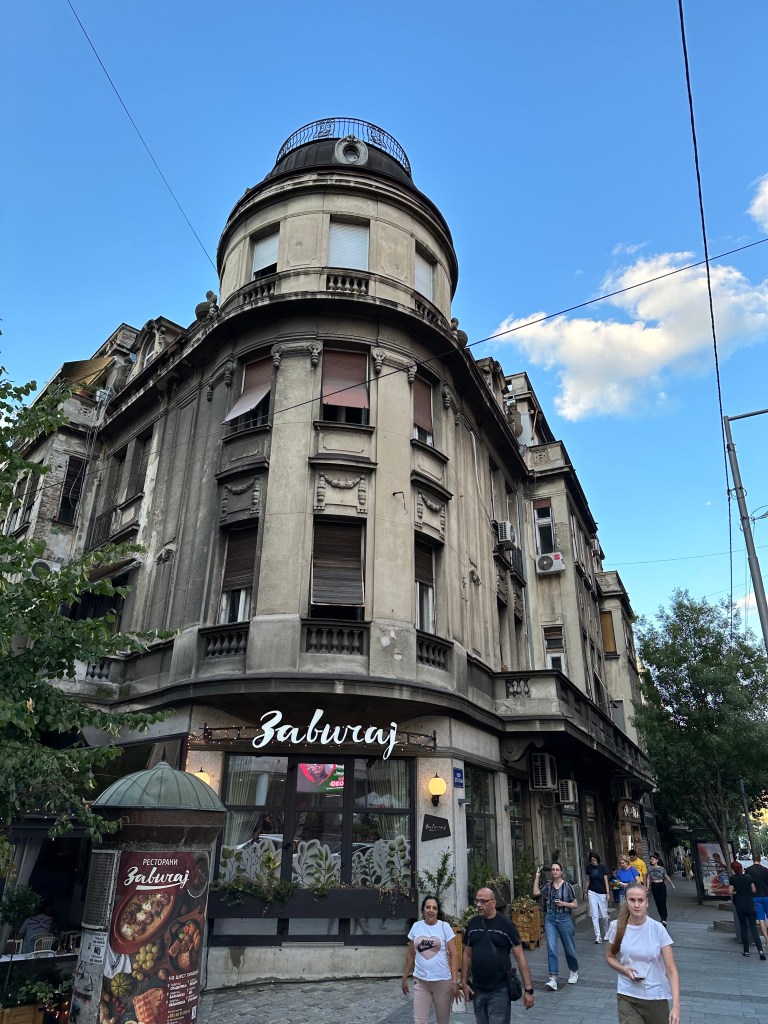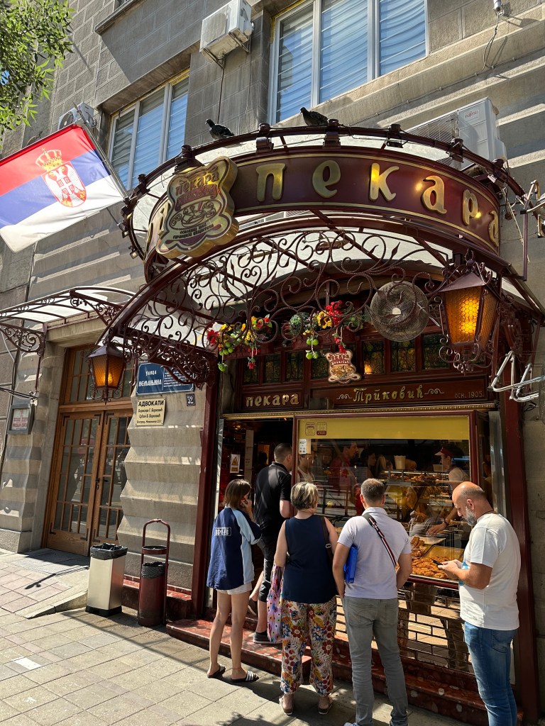 Serbian cuisine leans heavily on grilled meats and pies. Ćevapi are the flag bearer, even if Bosnia claims them too, and they rarely disappoint. Ajvar, made from red peppers, eggplant, and garlic, was the standout for me. Sweet, smoky, and just spicy enough, it works with almost everything. Serbian salad, a simple mix of tomatoes, cucumbers, onions, and salty white cheese, shows up everywhere and does exactly what it needs to do. Burek is a staple and Trpković Bakery lives up to its reputation with crisp, generously filled pastries, though slightly greasier than ideal. Meals are often paired with rakija, the local fruit brandy that is deceptively strong, sometimes spicy, occasionally anise-forward, and very much not meant to be rushed. Desserts are less emphasized, but the famous Moscow Cake at Hotel Moskva is spoken of with reverence. Visually stunning, though for me, overly sweet and flatter in flavor than expected.